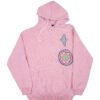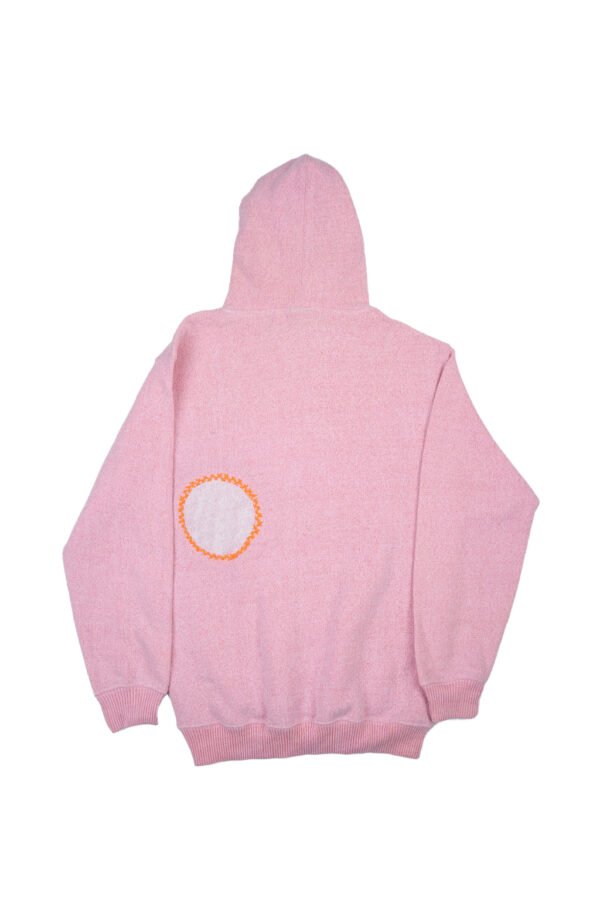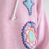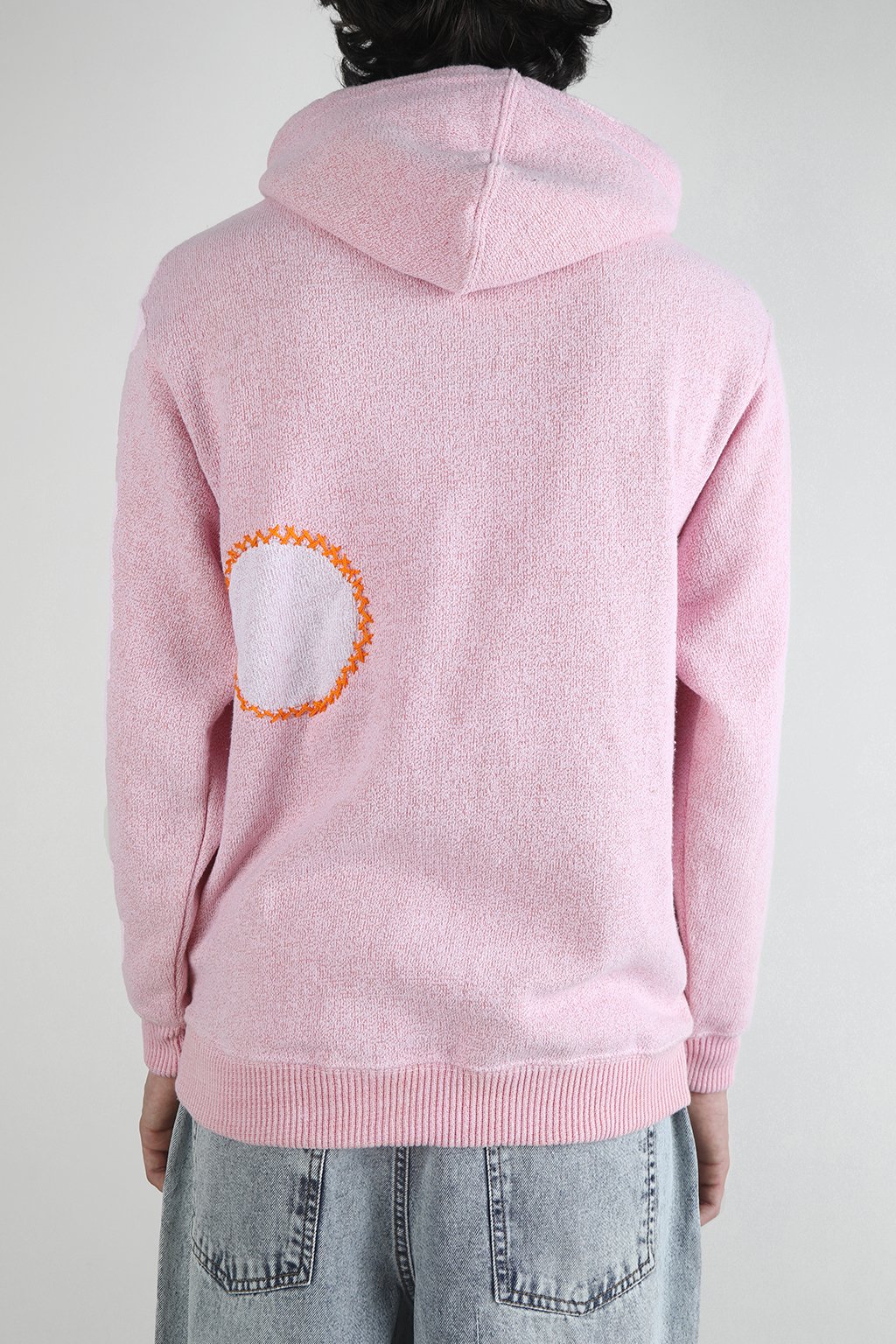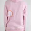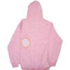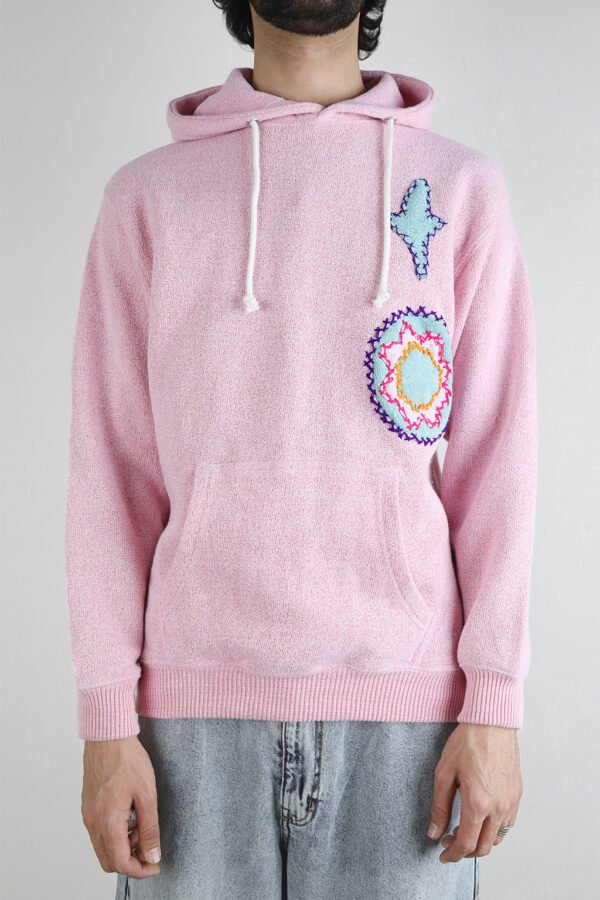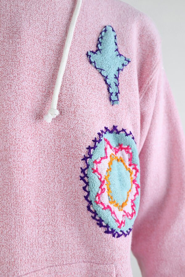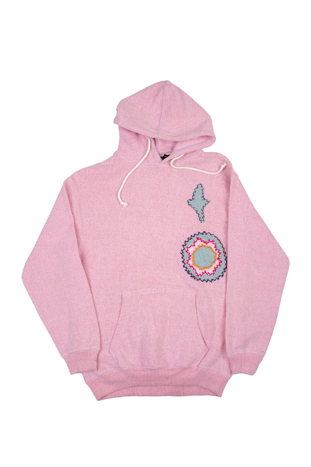 Midweight towel fleece hoodie in soft pink with embroidered chest and back patches. Textured surface with ribbed finish and white drawstrings. Designed for casual layering with playful contrast.