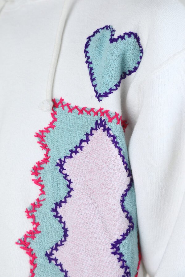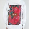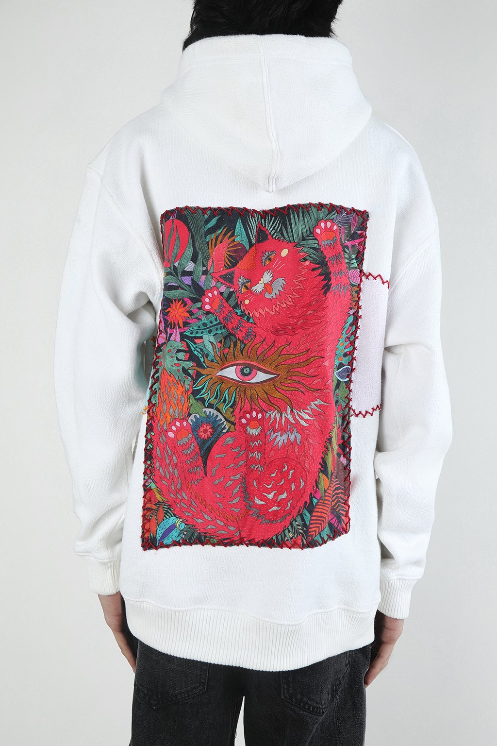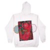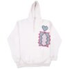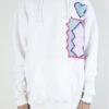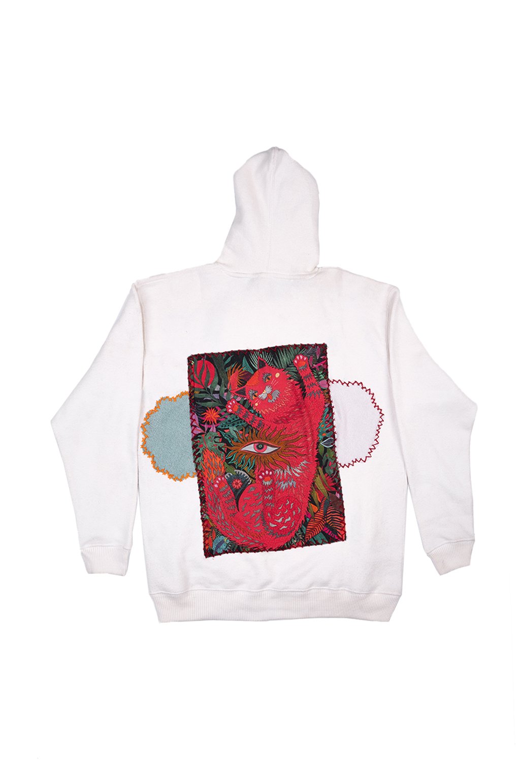 White towel fleece hoodie with jagged chest embroidery and vivid back artwork. Blue heart and zigzag patch up front, red feline face framed in foliage on the back.