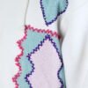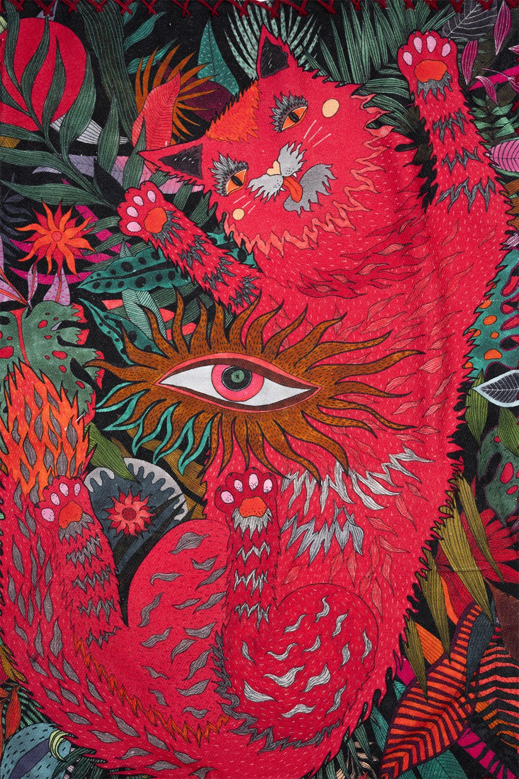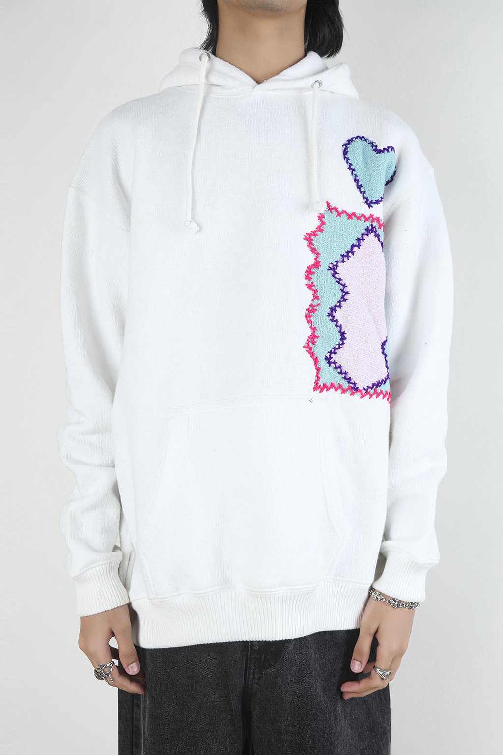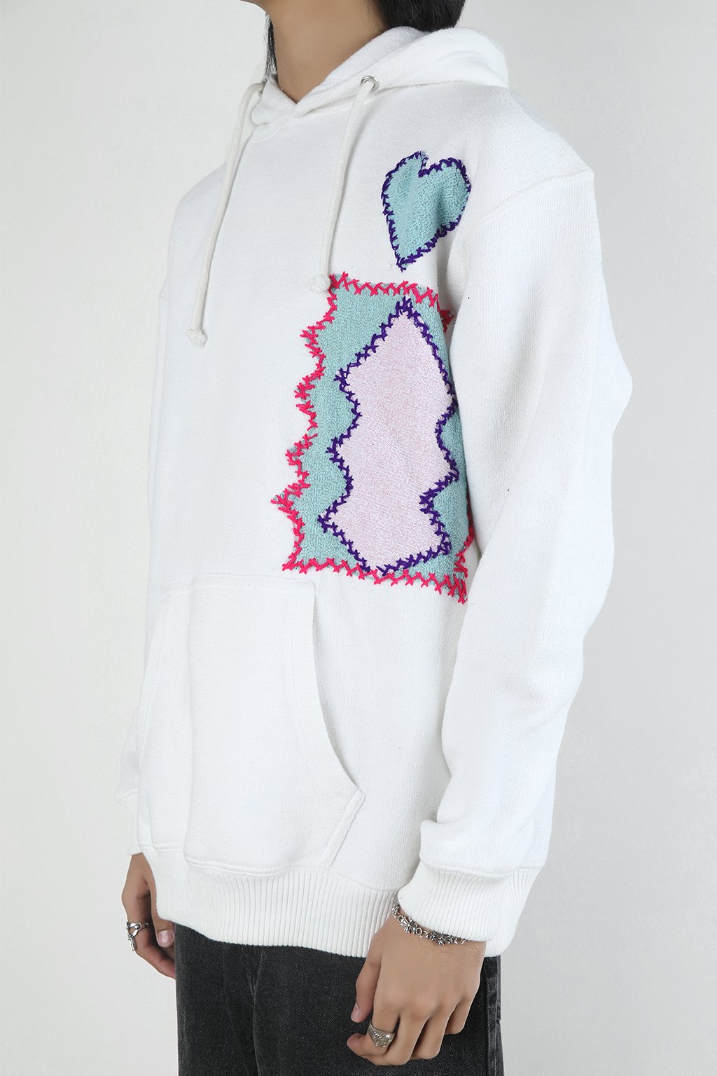 White towel fleece hoodie with jagged chest embroidery and vivid back artwork. Blue heart and zigzag patch up front, red feline face framed in foliage on the back.
