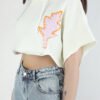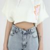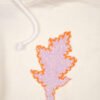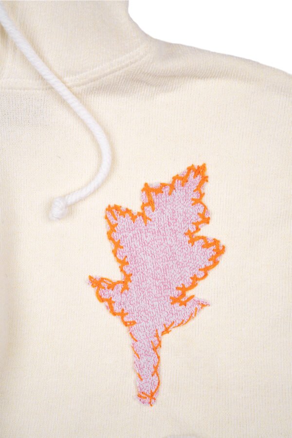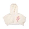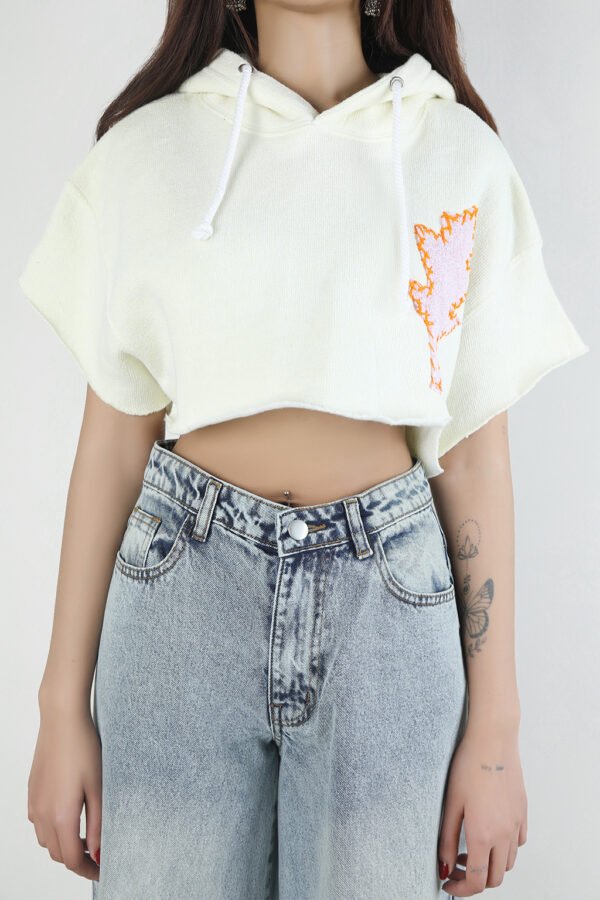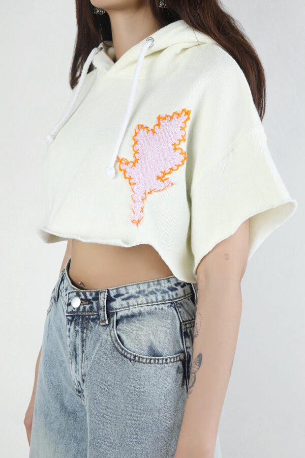 Cropped towel fleece hoodie in off-white with short sleeves and raw hem. Embroidered flame patch on chest adds bold contrast.