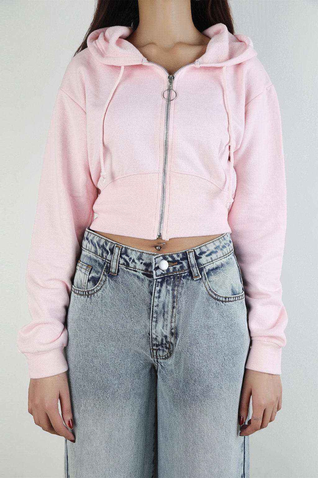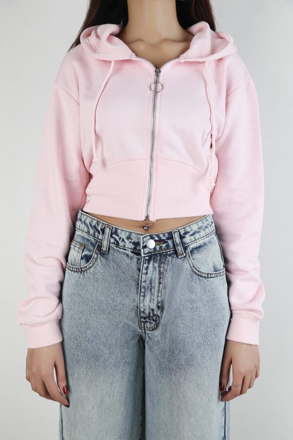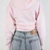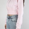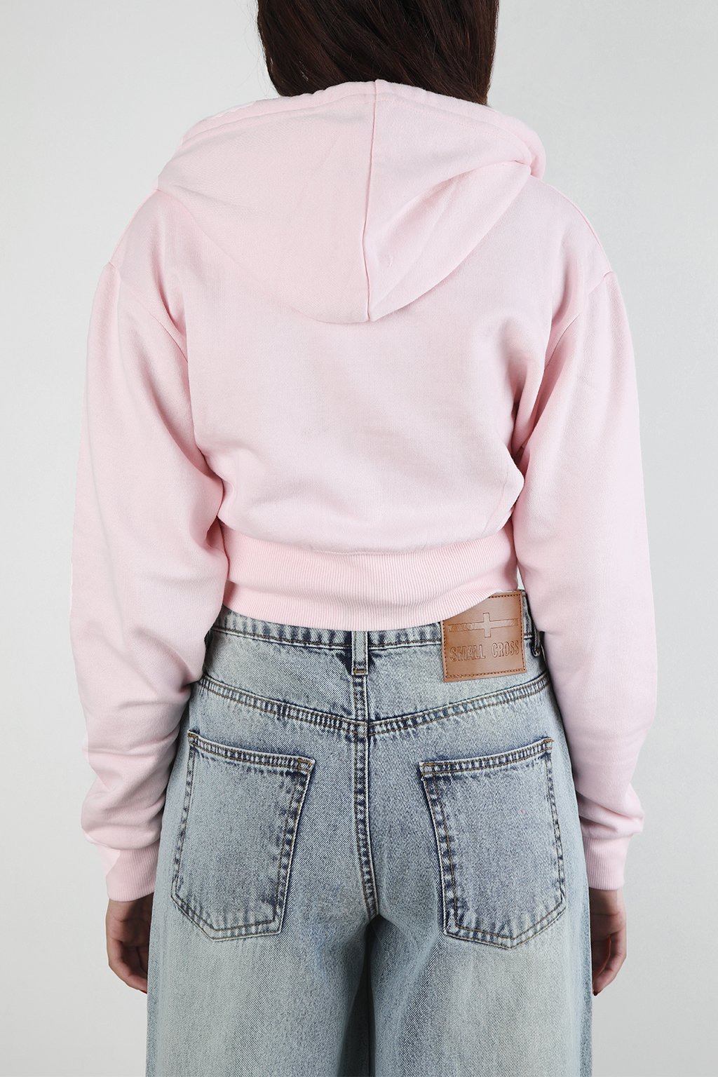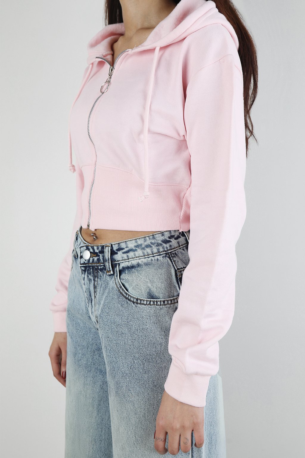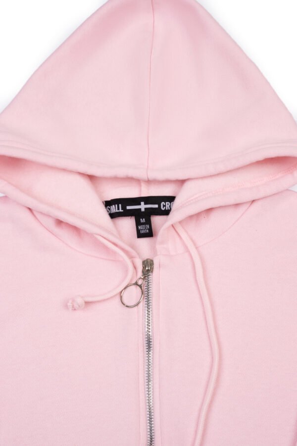 Cropped hoodie in soft blush towel fleece with a clean zip front and subtle rib detailing. gentle tone and smooth texture make it ideal for quiet layering.