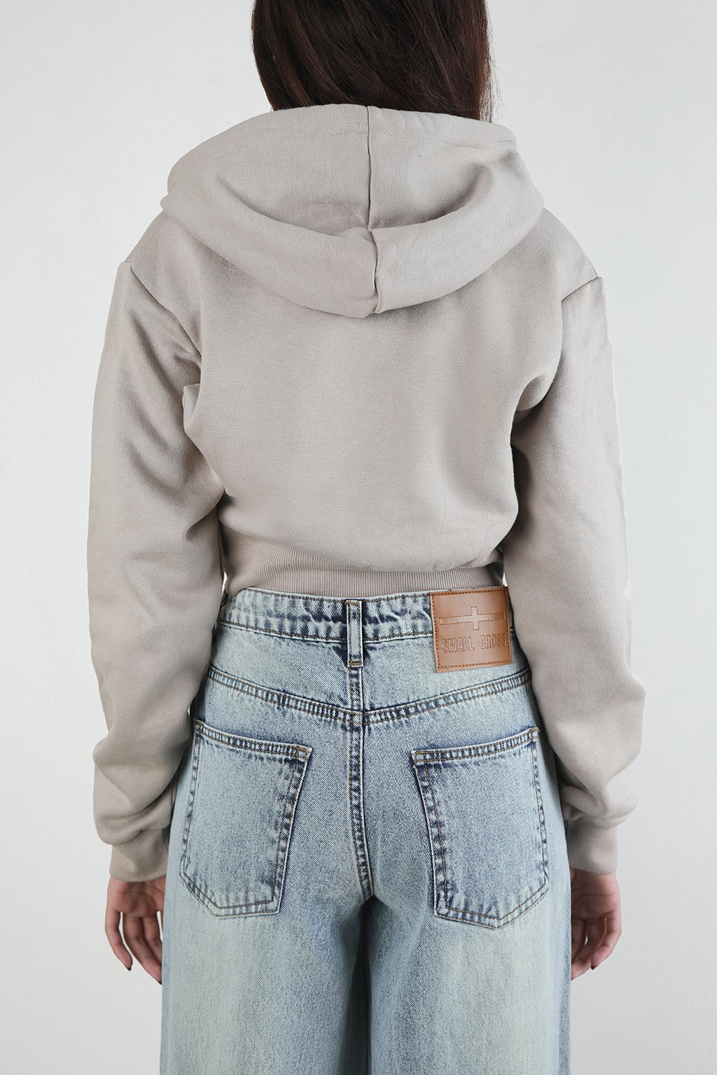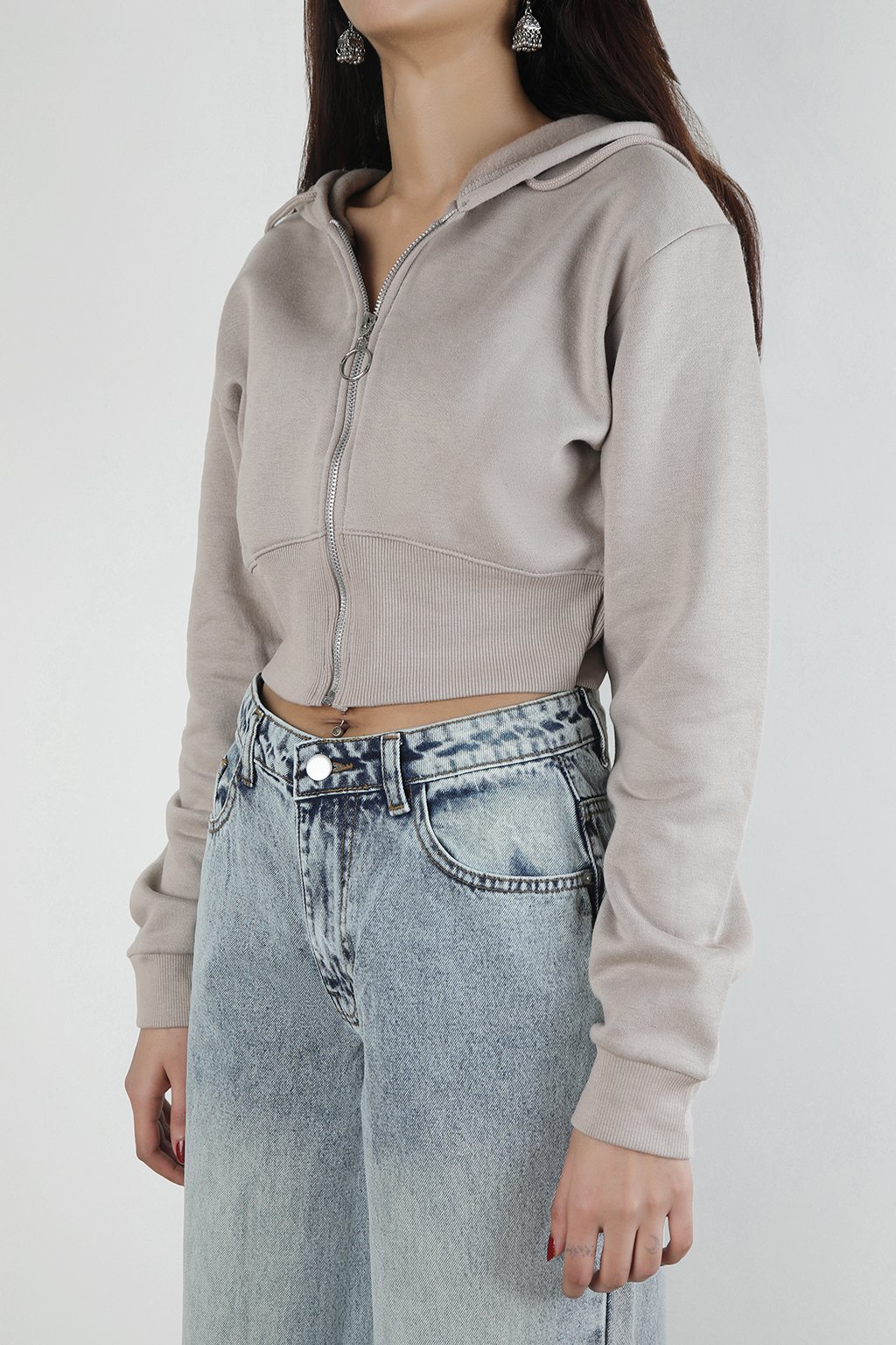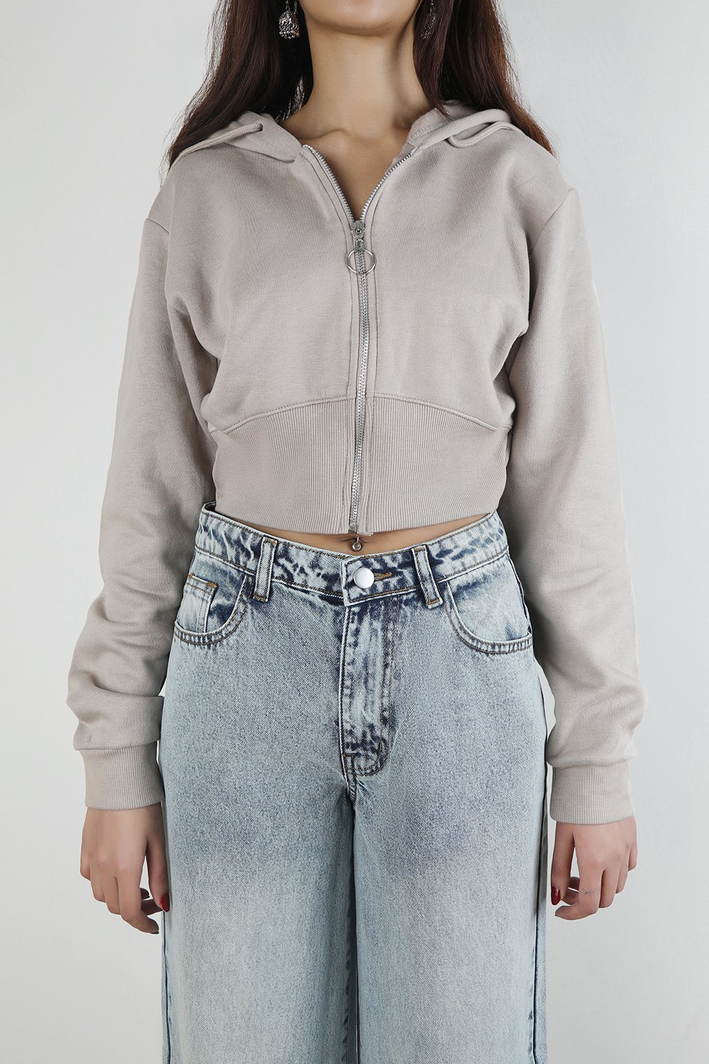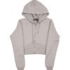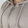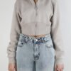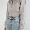 Cropped zip-up hoodie in soft beige towel fleece with a fitted waist and ribbed cuffs. Clean silhouette and muted tone, built for everyday layering with quiet structure.