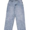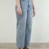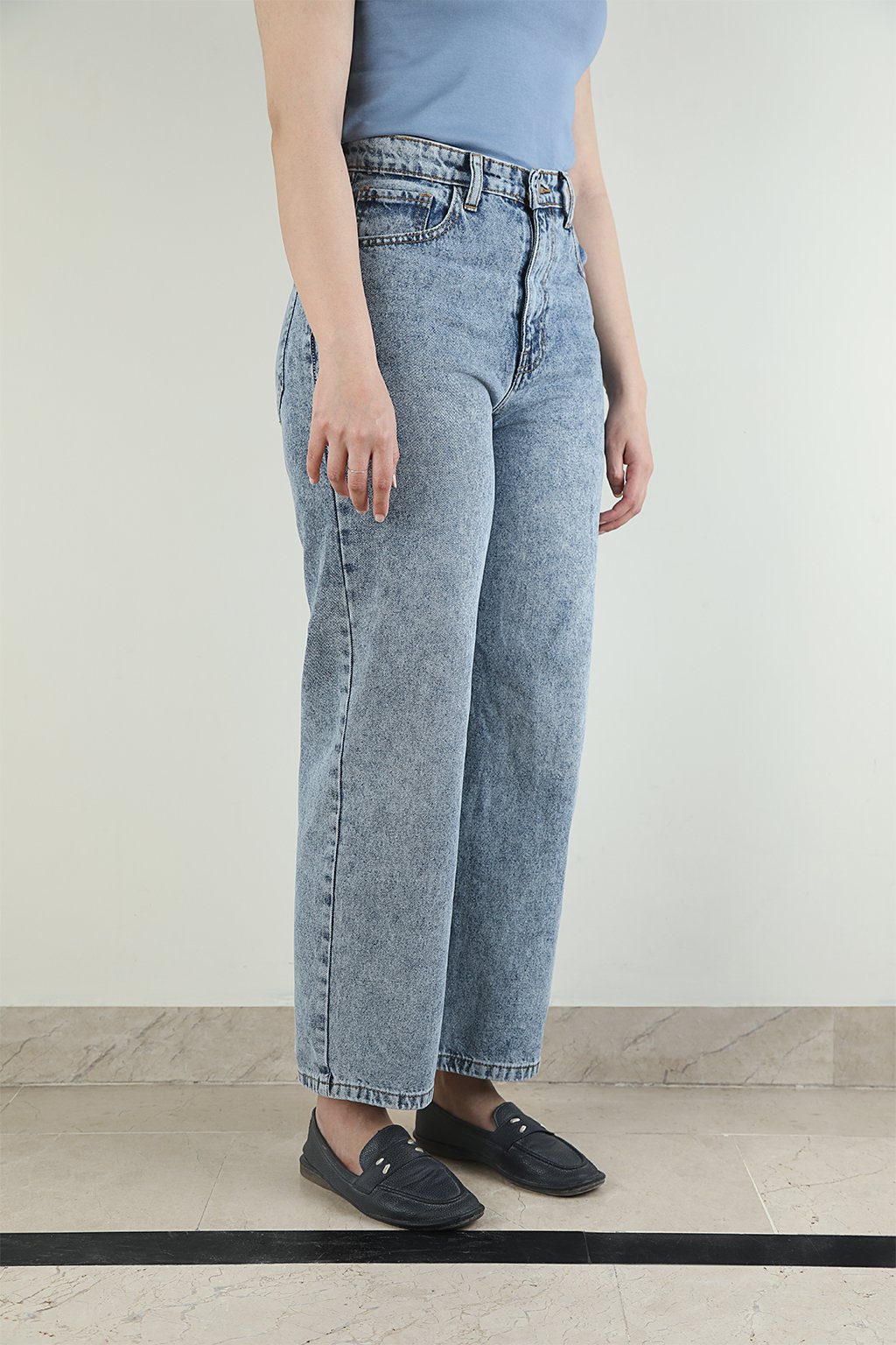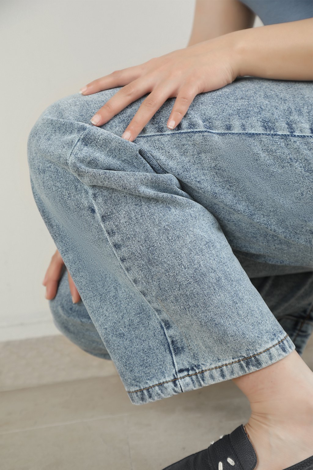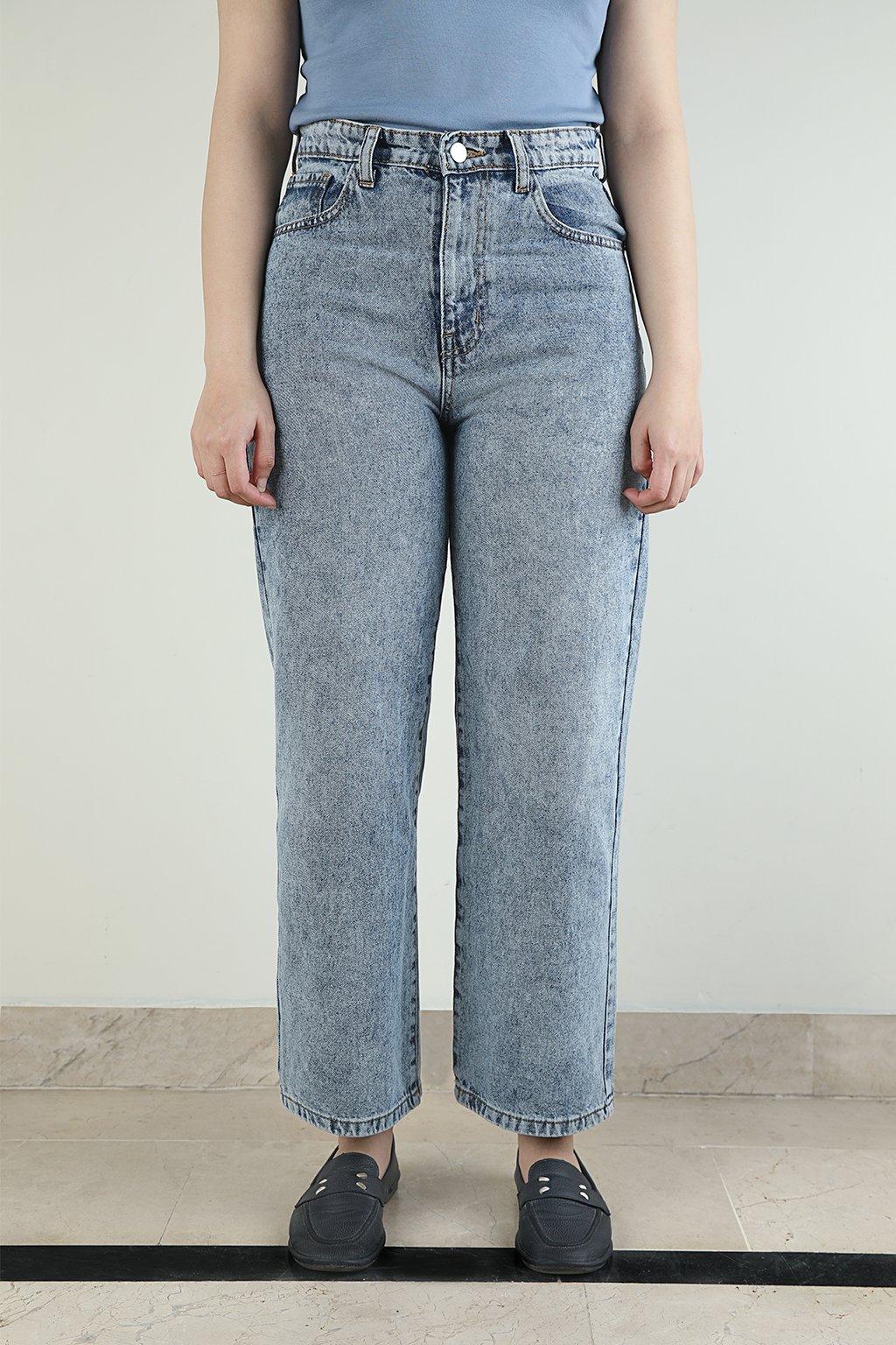 High-waisted straight-leg denim in acid-washed blue with a soft vintage fade. Clean silhouette with classic texture and relaxed everyday fit.