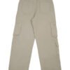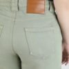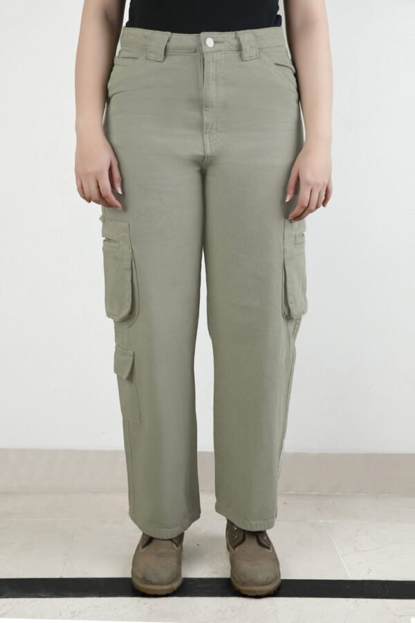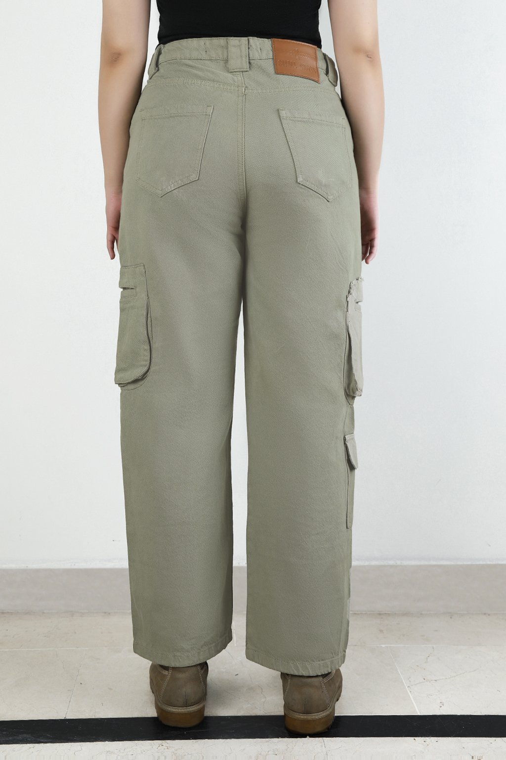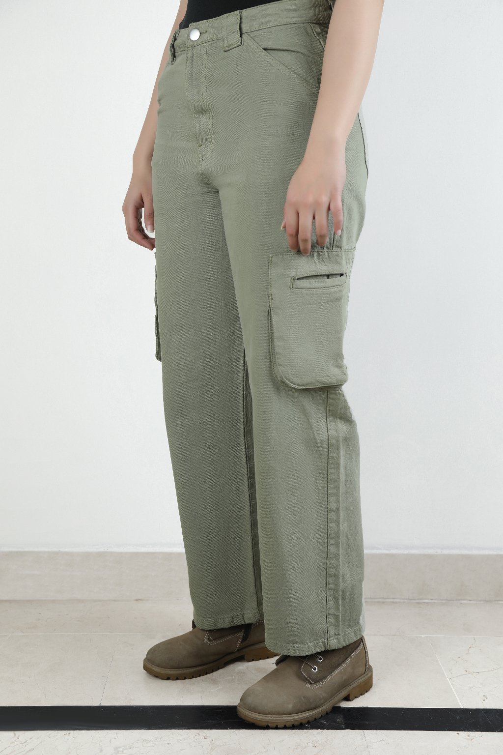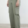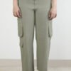 High-waisted cargo pants in olive green cotton twill with a relaxed, structured fit. Utility pockets and clean lines designed for everyday wear with minimal branding.
